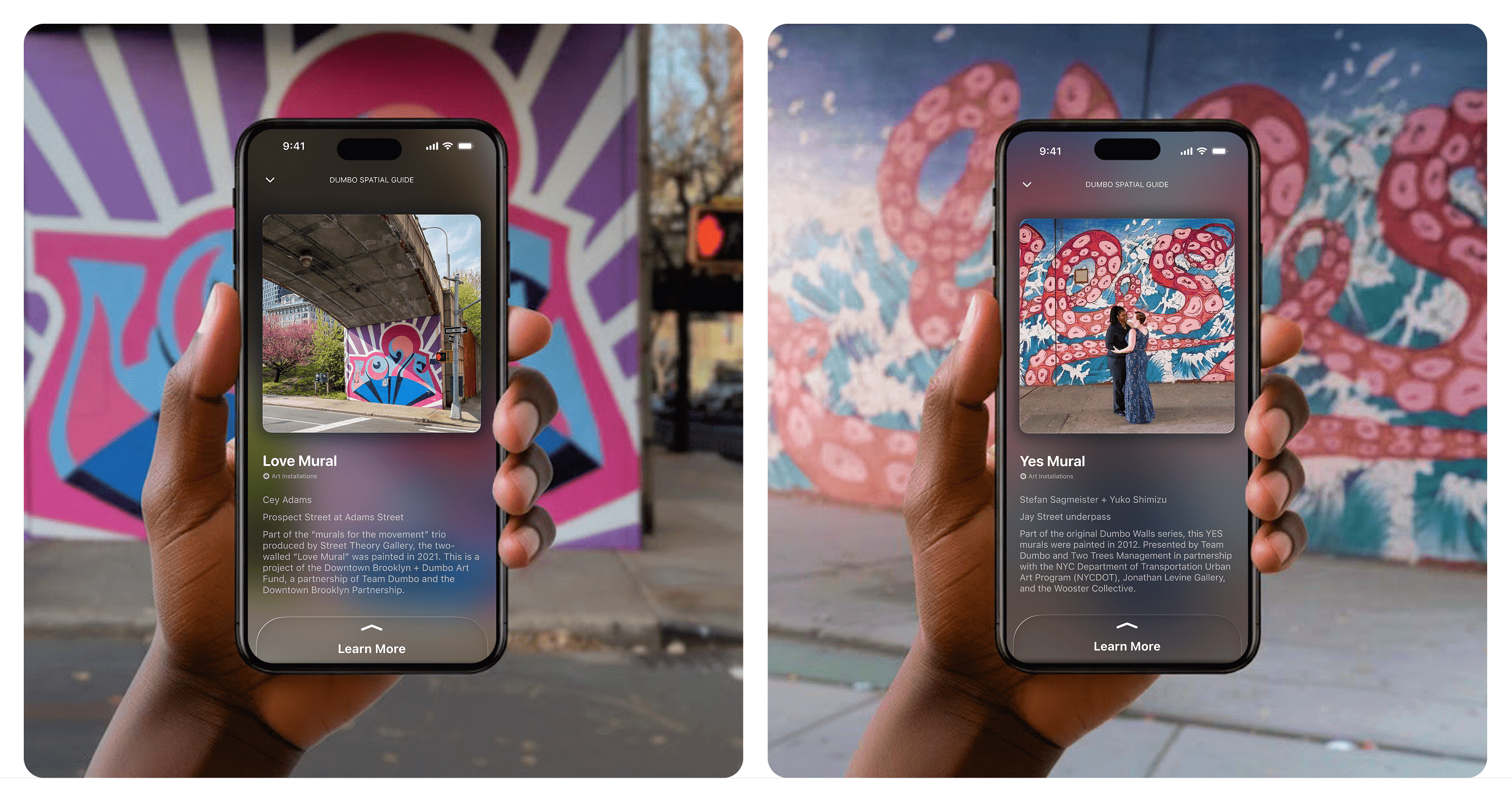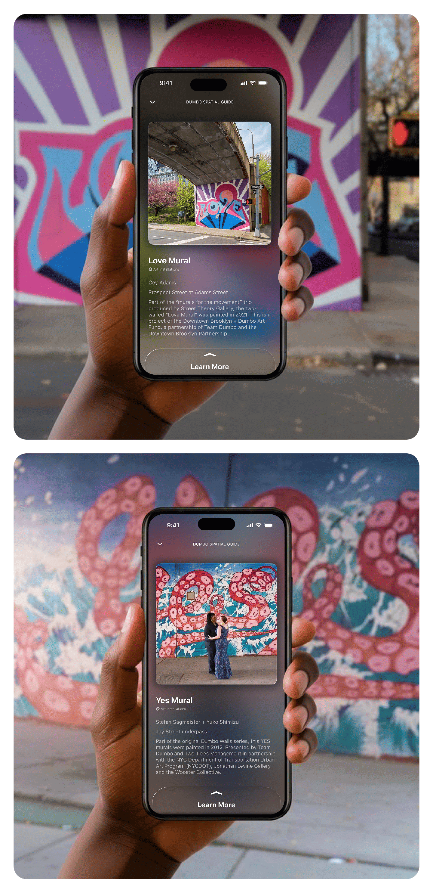 To streamline operations, we developed a unique "look and tag" content management system. This allows organizers to train the computer vision model simply by wearing the glasses, looking at an object, and verbally tagging it. This removed the need for complex backend coding, empowering curators to digitize the neighborhood's 8 art walls and projection projects effortlessly.
